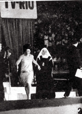 O Direito de Nascer teve festa de encerramento no Estádio do Maracanãzinho no Rio de Janeiro. Nathalia Timberg (Sóror Helena) aparece na foto com Guy Loup, a Isabel Cristina da novela