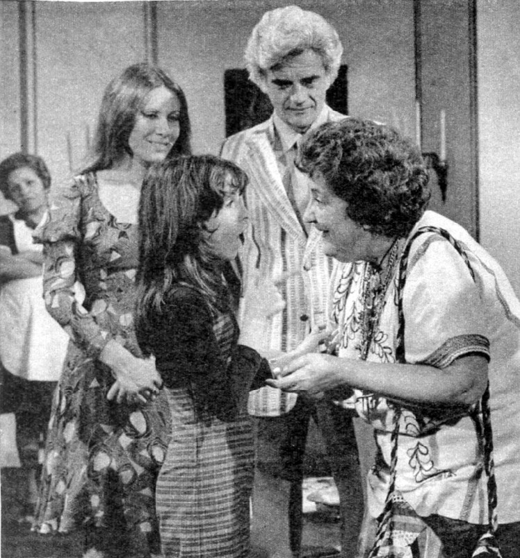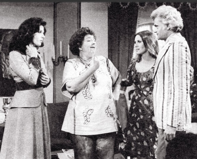 | Zilka Salaberry com Maria Luiza Castelli, Osvaldo Loureiro e Cláudia Loureiro em Corrida do Ouro (TV Globo, 1974/75), novela de Gilberto Braga e Lauro César Muniz |